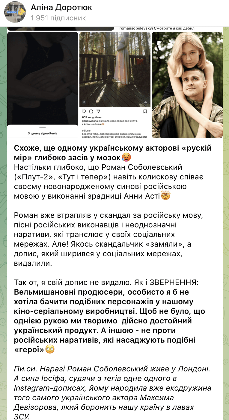 На допис Доротюк відреагував сам Соболевський. Актор вибухнув в істериці після прочитаного. Він видав, що журналістка нібито виставляє українців "безграмотними та безталанними колхозанами". А про звернення до продюсерів сказав, що її ніхто слухати не буде.