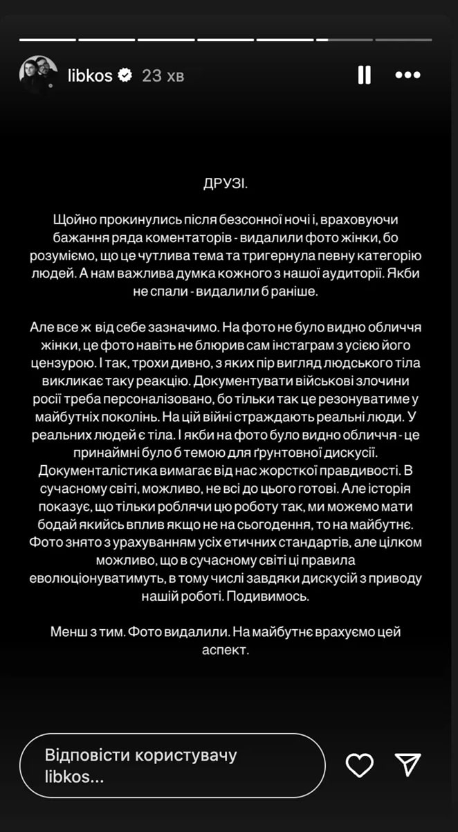 "І так, трохи дивно, з яких пір вигляд людського тіла викликає таку реакцію. Документувати воєнні злочини Росії треба персоналізовано, бо тільки так це резонуватиме у майбутніх поколінь. На цій війні страждають реальні люди. У реальних людей є тіла. І якби на фото було видно обличчя – це принаймні було б темою для ґрунтовної дискусії", – зауважили Ліберови.