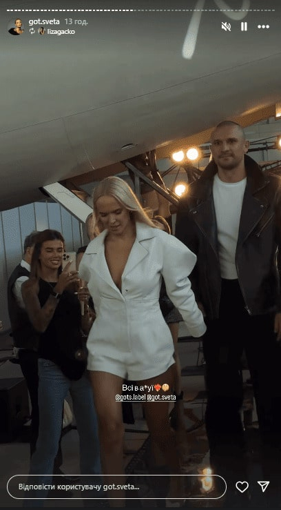 Артист вирішив підтримати ексобраницю. Річ у тім, що Світлана Готочкіна презентувала в Києві нову колекцію свого одягу. Модний показ минув в одному з ангарів столиці. Моделі виходили з літака та дефілювали подіумом, який був у вигляді крила літального апарату.