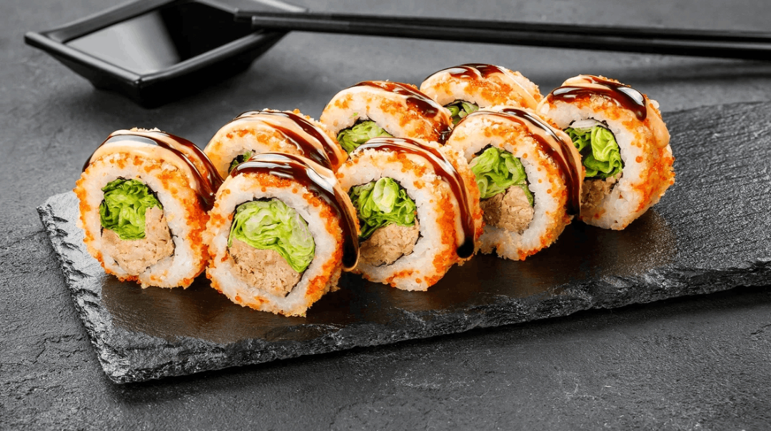 - Кран з тунцем - рол із хрустким ефектом, який створює контраст із ніжною текстурою риби.